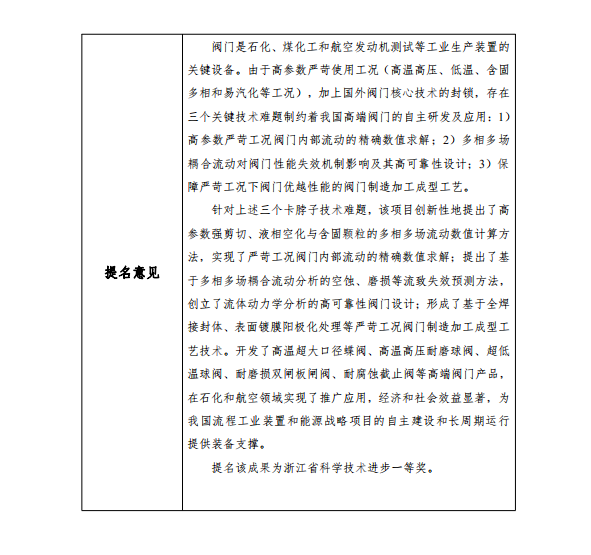 根據(jù)《浙江省科學(xué)技術(shù)廳關(guān)于開展2021年度浙江省科學(xué)技術(shù)獎(jiǎng)提名工作的通知》要求,現(xiàn)對(duì)我單位擬參與申報(bào)的浙江省科技獎(jiǎng)勵(lì)項(xiàng)目“嚴(yán)苛工況閥門關(guān)鍵技術(shù)及應(yīng)用”予以公示,公示期7天(2022年2月26日至2022年3月4日)。